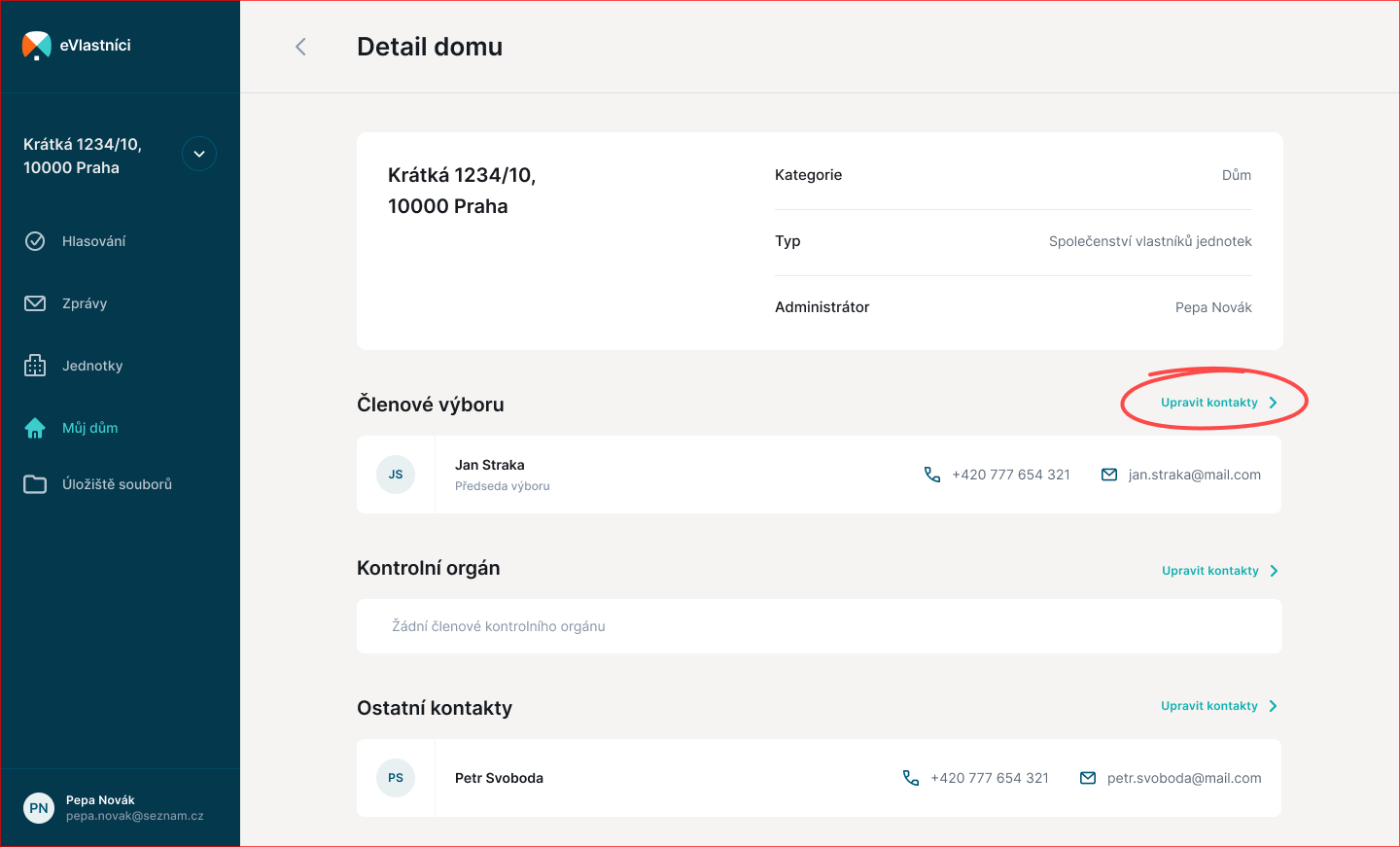V sekci Detail domu máte možnost přidat kontaktní údaje rozdělené do tří kategorií: