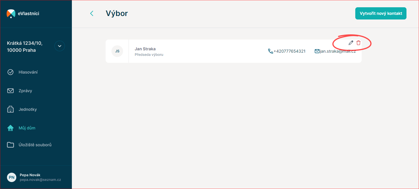 Editaci i výmaz kontaktu provedete ve stejné sekci jako jste kontakt vytvořili, tedy skrze kliknutí na tlačítko "Upravit kontakty". Zde už u každého záznamu uvidíte ikony pro úpravu nebo výmaz, ikony se zobrazí po najetí kurzorem na položku.